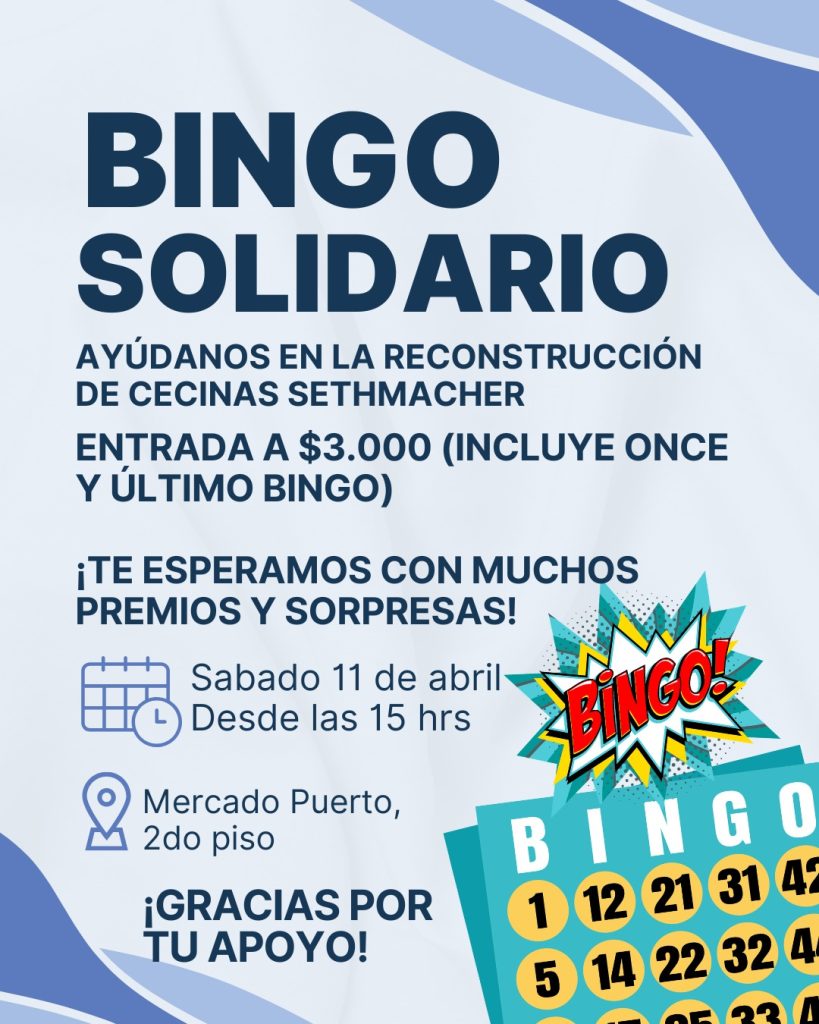 La alcaldesa de Valparaíso, Camila Nieto, entregó todo su apoyo a esta iniciativa señalando que “como Municipalidad de Valparaíso, valoramos profundamente las iniciativas solidarias que nacen desde los propios barrios y que reflejan el compromiso de la comunidad con su historia y su identidad. Por eso, queremos invitar a vecinas, vecinos y visitantes a sumarse al Gran Bingo Solidario en apoyo a Cecinas Sethmacher, un local emblemático de Barrio Puerto que fue gravemente afectado por el incendio del año pasado. Esta actividad, que se realizará el sábado 11 de abril en el segundo piso del Mercado Puerto, es una oportunidad para reencontrarnos, colaborar y aportar a la reconstrucción de este querido espacio del comercio local. Como municipio, estamos apoyando este tipo de instancias porque creemos en la importancia de fortalecer la economía barrial y el tejido social que da vida a nuestra ciudad”.