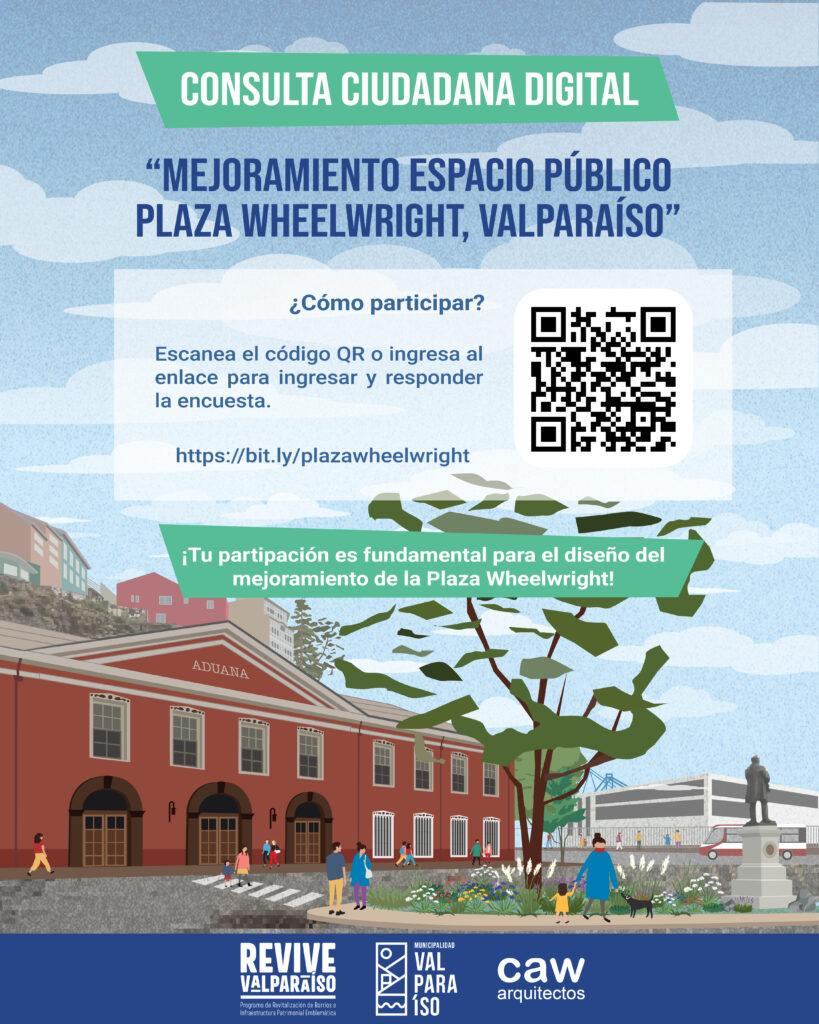 La encuesta online estará abierta hasta el 23 de diciembre y llenarla demora solo cuatro minutos. La Ilustre Municipalidad de Valparaíso, junto a la SUBDERE, la Corporación del Sitio Patrimonio Mundial de Valparaíso y la consultora CAW Arquitectos, instan a la comunidad a participar en la consulta digital dirigida a las vecinas y vecinos de la comuna, con el objetivo de recopilar experiencias, opiniones y propuestas ciudadanas para el proyecto de diseño del mejoramiento del espacio público Plaza Wheelwright. Esta iniciativa forma parte de la Etapa N°1 del Plan de Participación Ciudadana, denominada “Diagnóstico y levantamiento crítico”, ejecutada por la consultora en el marco del proyecto; y su propósito es integrar las necesidades de la comunidad desde el inicio del diseño arquitectónico. En esta fase, la participación ciudadana tendrá un carácter informativo y consultivo. Este diseño de mejoramiento forma parte de la cartera de inversión del Programa de Revitalización de Barrios e Infraestructura Patrimonial Emblemática, PRBIPE, también denominado “Revive Valparaíso”, que cuenta con financiamiento de la SUBDERE. A su vez, esta iniciativa pertenece al “Plan Piloto Barrio Puerto” del Plan de Gestión del Sitio Patrimonio Mundial de Valparaíso. La consulta consiste en una encuesta digital que estará habilitada hasta el 23 de diciembre, cuyo propósito es conocer las experiencias, intereses y propuestas de las y los habitantes de Valparaíso respecto al espacio público a intervenir, información que permitirá construir un diagnóstico comunitario que sirva de base para el diseño de arquitectura. La encuesta solo demora cuatro minutos en ser llenada, por lo que el municipio enfatizó que la participación de la comunidad es fundamental para avanzar hacia un diseño que refleje las verdaderas necesidades y requerimientos de quienes viven, recorren y utilizan la Plaza Wheelwright en Valparaíso. Las y los interesados pueden acceder directamente a la consulta, a través del escaneo del código QR disponible en las piezas de difusión, en las cuentas de Instagram @secplavalpo o @corporaciónspmvalparaíso, o bien, ingresando al siguiente enlace: https://bit.ly/plazawheelwright
