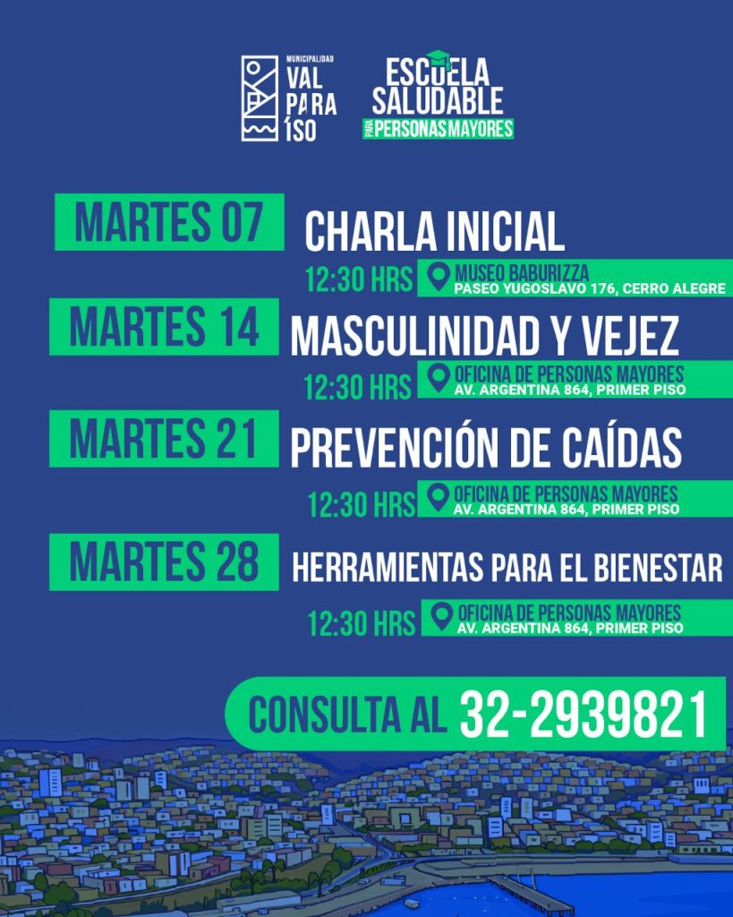 La Escuela Saludable contempla un ciclo de charlas informativas y preventivas durante el mes de abril, abordando temáticas como masculinidad y vejez, prevención de caídas y herramientas para el bienestar. Las actividades se realizan en la Oficina de Personas Mayores, ubicada en Av. Argentina 864, a las 12:30 horas, y están abiertas a toda la comunidad mayor interesada en avanzar hacia un envejecimiento activo y saludable.