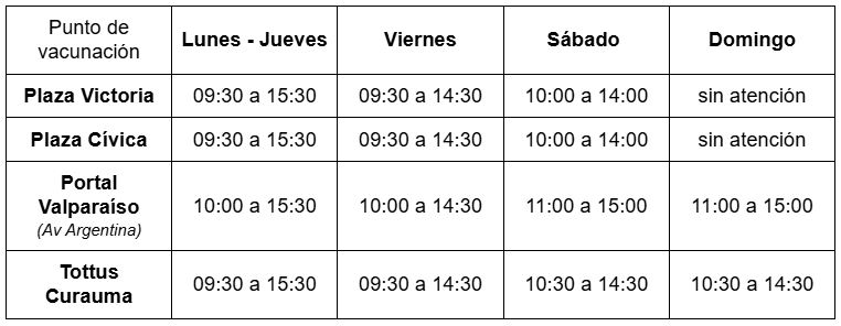 Además de los vacunatorios propios de cada CESFAM, se han habilitado puntos de vacunación en Plaza Victoria, Plaza Cívica, Portal Valparaíso (Jumbo Av Argentina) y en el supermercado Tottus de Placilla de Peñuelas.