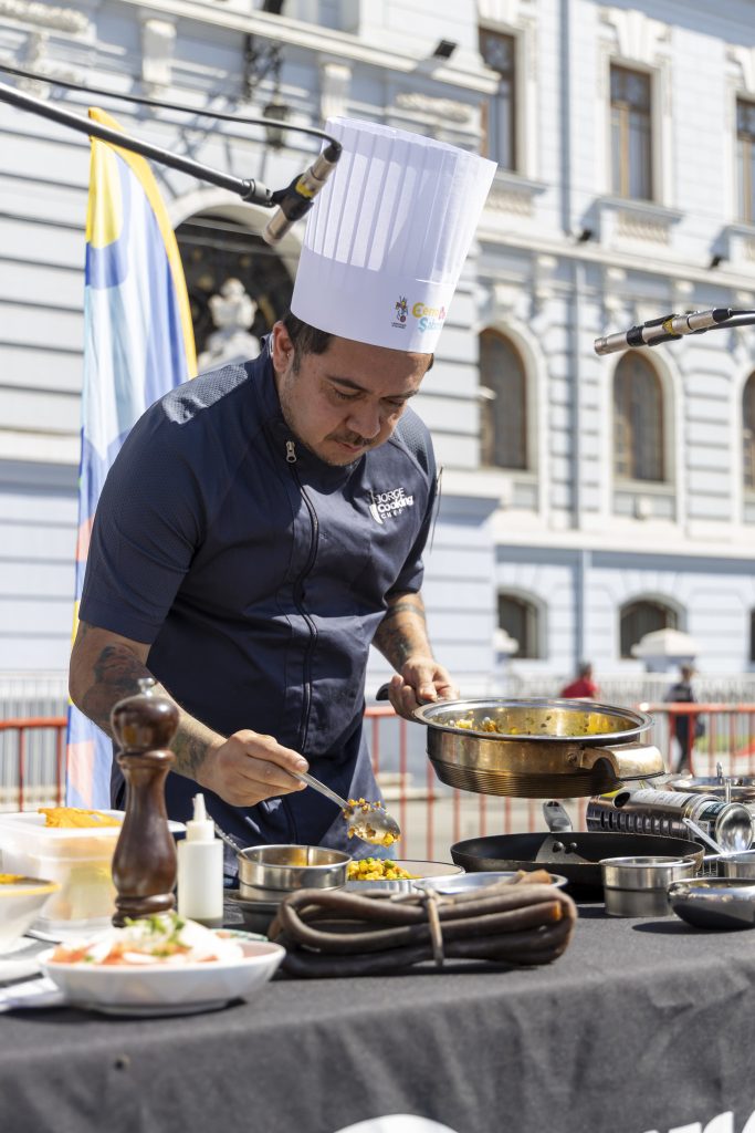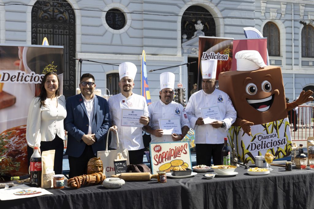Luego, desde las 11:00 horas, la Plaza Sotomayor se transformó en el punto de encuentro de la cocina chilena con una gran activación gastronómica, con una cocina interactiva donde destacados chefs y representantes de tradicionales restaurantes del sector prepararon platos típicos en vivo, compartiendo recetas, técnicas y relatos que dan vida a la tradición culinaria chilena y porteña.