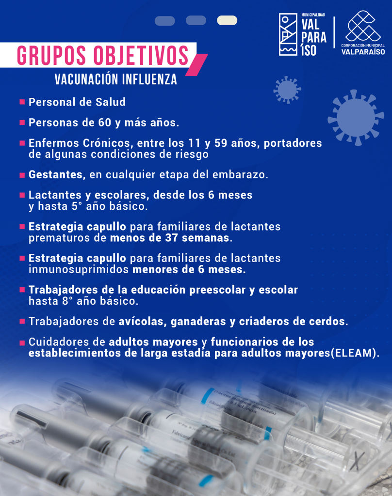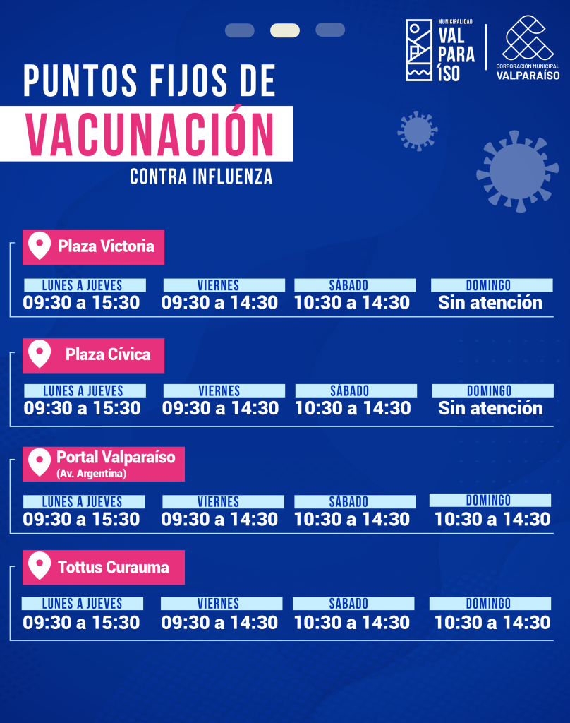 “Tenemos el encargo de la alcaldesa Camila Nieto de disponer todos los recursos, para facilitar la vacunación este año. Por eso hemos dispuesto múltiples puntos de vacunación en la comuna”, indicó el director de Salud Municipal de Valparaíso, doctor Carlos Guerrero. “Hacemos el llamado a nuestros vecinos y vecinas, a que se acerquen a vacunarse, esto es tremendamente importante, la vacunación es un objetivo que debemos cumplir y además es un acto solidario, ya que se está protegiendo a sí mismo, a su familia, a sus seres queridos, a sus vecinos y vecinas”. precisó el médico.